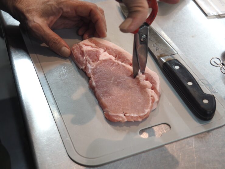 肉を焼く時、そのまま焼くと、肉が反り返ってしまった経験はありませんか。反り返らないように、脂身と赤身の間の筋を切るという作業をすることで、肉の反り返りを防ぎます。普通、包丁を使って切っていくことが多い「筋切り」ですが、今日はキッチンはさみを使ってチャレンジしてみました。どのテーブルの豚肉も反り返ることなく、まっすぐきれいに焼けていました♪ たっぷりのせん切りキャベツといっしょにどうぞ!