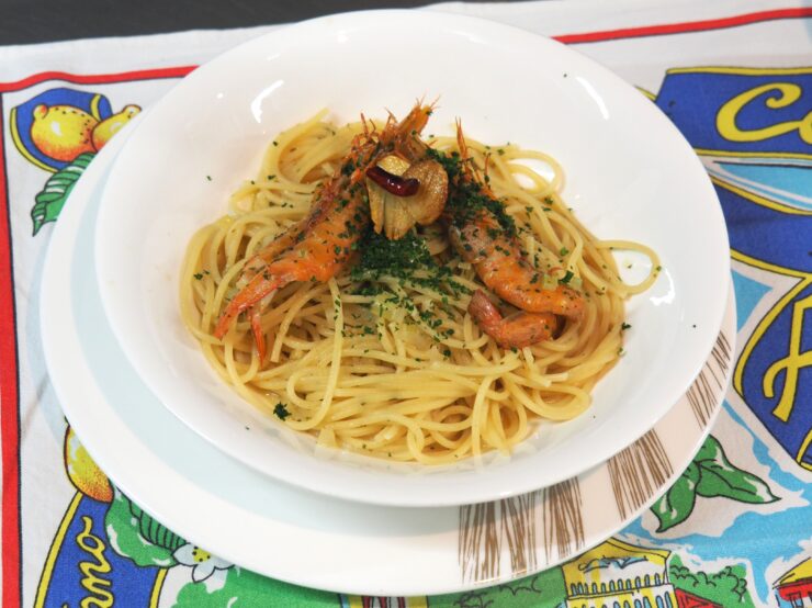 【 Spaghetti all’aglio olio e peperoncino con gamberini. スパゲティー エビのペペロンチーノ】