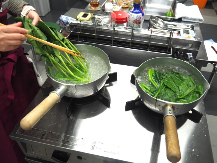 『ほうれん草のごま和え』では青菜のゆで方、青菜のしょうゆ洗いの技法を学びました。