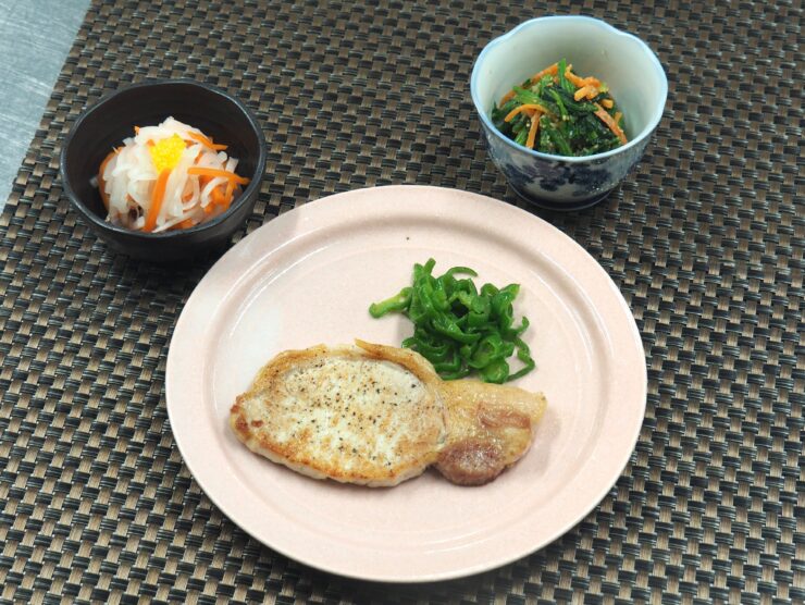 メニューは「とうふとわかめのすまし汁」「大根と油揚げの煮物」「鮭の照り焼き」です。