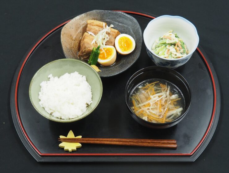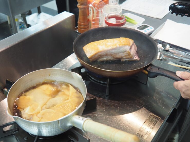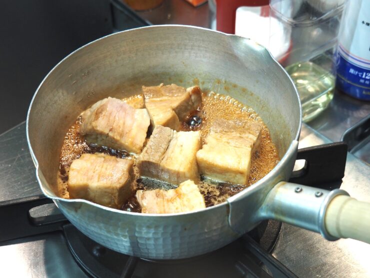 豚の角煮を柔らかく仕上げるコツは、弱火でじっくりと時間をかけて煮込むことです。教室では時間の都合上、下茹でした状態から調理をスタートしましたが、味付けをして煮込む時間だけでも1時間以上。ゆっくり火を通すことで、お肉がしっとりとやわらかく仕上がります。