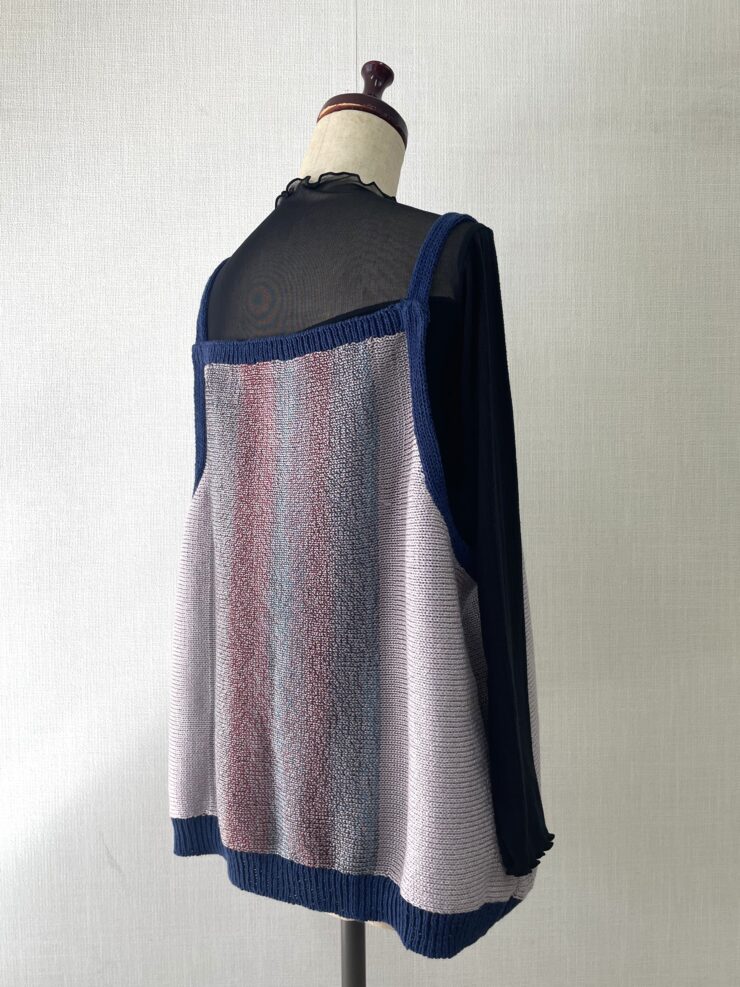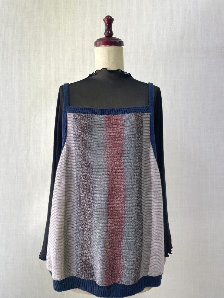 「最近、街中でもよく見かけるようになったビスチェに挑戦されました。手編みの先生からいただいた残り糸の段染め糸をメインに、左右の色合いをバランスよく配色して編み進めたことで、とても素敵な仕上がりの「ニットビスチェ」になりました。」