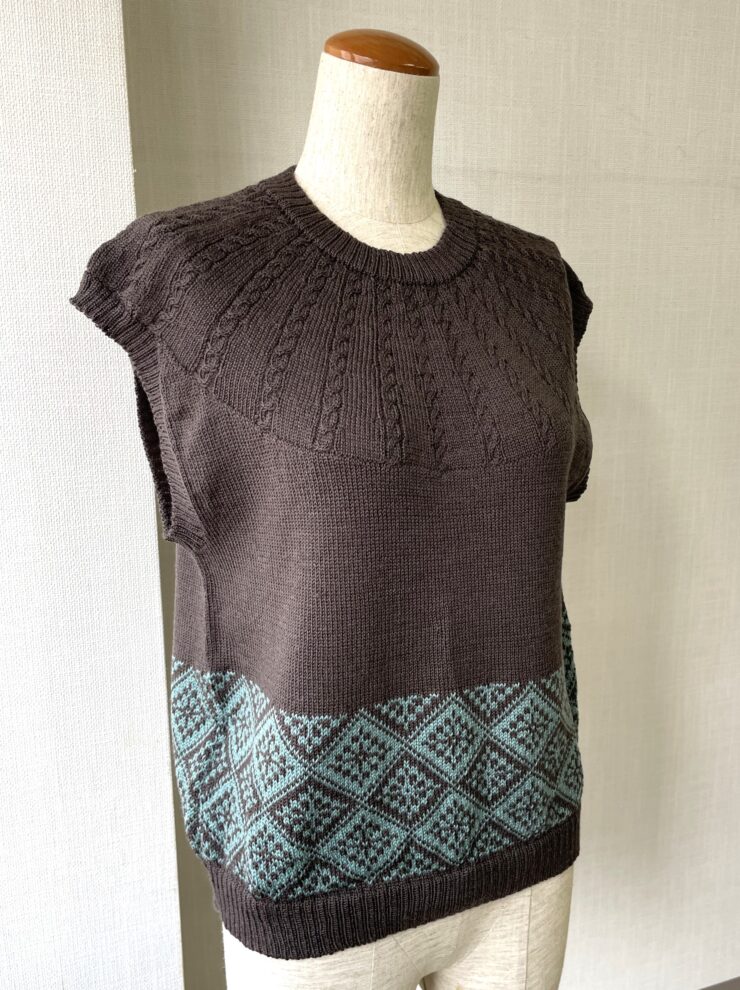 「パピーの3PLYの糸を使った作品を作りたい」と先生に相談したところ、「細い糸なので、薄手の編み込み作品ができますよ。丸ヨークの勉強も一緒にできるデザインにしては?」