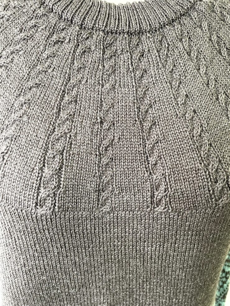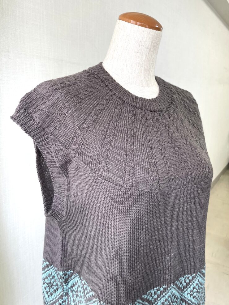 「編み込みはとかくゴワッとした仕上がりになりがちですが、合細タイプの糸で編むことで、薄く繊細な模様に仕上がります。丸ヨークの勉強もしたいとのご希望があり、縄編と縄編の間で分散減目を入れながらヨークを編みました。首元に向かって模様が少しずつ小さくなり、全体がすっきりとまとまった、きれいな仕上がりになりました。」