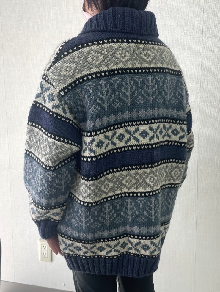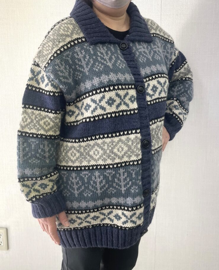 「パンチカードを使って編み込みができる編み機「シルバーリード9(SK155)」で編まれました。配色を決める際には、机の上にたくさんの毛糸を並べ、「これとこれがいいね」「いや、こっちも素敵」と楽しく相談しながら決定。色も柄もオリジナルの、世界に一枚だけの素敵なカーディガンが完成しました。とてもよくお似合いです。」