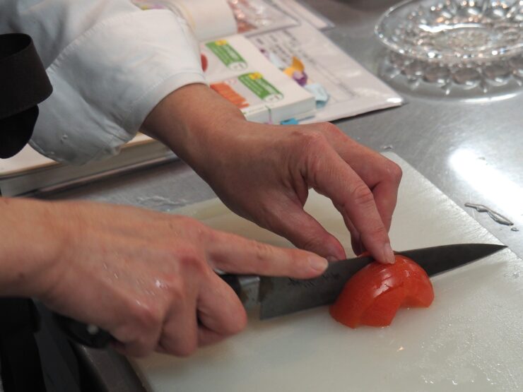 トマトの薄切り(4mm以下)、そしてアジの下処理、さらに高度な「三枚おろし」に挑戦しました。