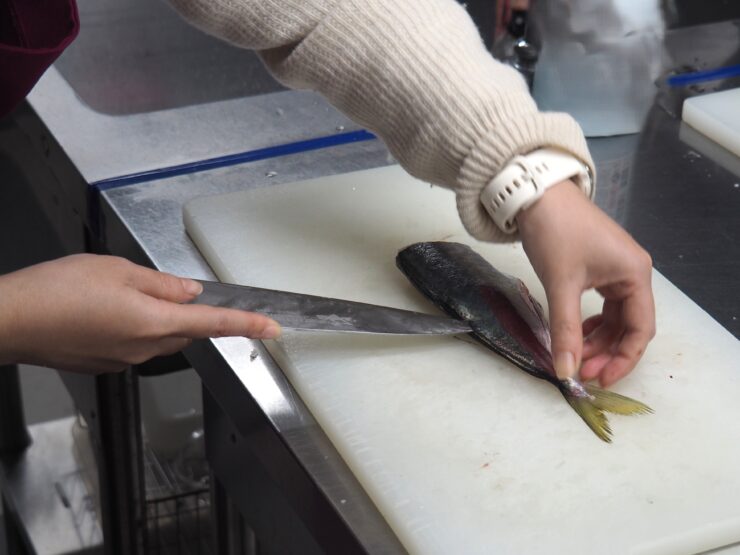 アジの下処理(うろこ、ぜいご、頭、内臓を取る)ができるようになるところまでがこのコースの最終目標でした。