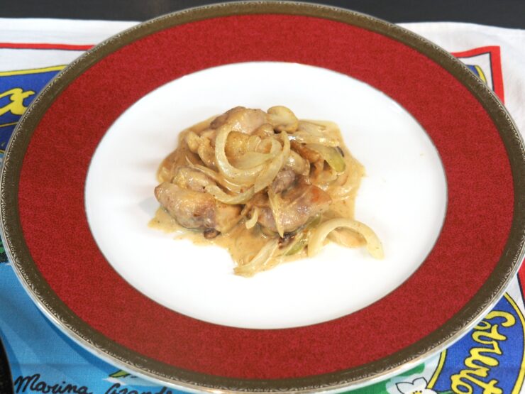 【 Pollo brasato alla crema. 若鶏モモ肉と玉ねぎ・マッシュルームのクリーム煮 】