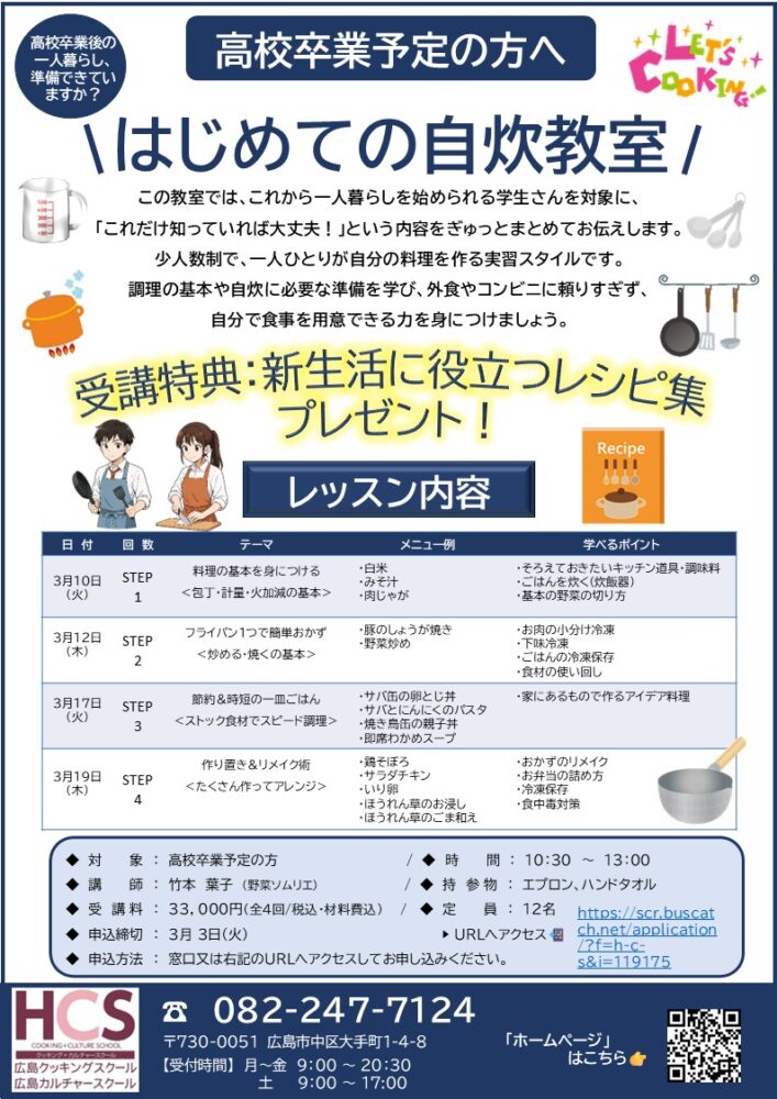 一人暮らしで本当に役立つことを中心に学びます。